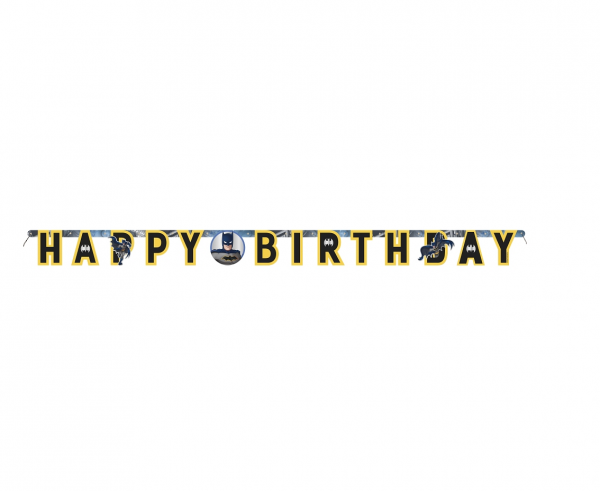 Papirnati Batman Happy Birthday natpis - banner dužine 175 cm ističe svaku rođendansku proslavu živim plavim, žutim i crnim tonovima te donosi atraktivan tematski ugođaj.