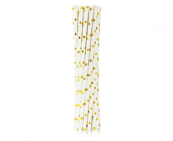 Bijele papirnate slamke duljine 19,7 cm i promjera 0,6 cm sa zlatnim zvijezdama. Pakiranje sadrži 12 komada, idealne za svečane proslave i dekoraciju pića.