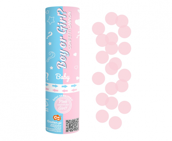 Elegantni ispaljivač konfeta s ružičastim papirnatim krugovima, savršen za nezaboravan gender reveal. Bez pirotehnike – sigurno izbacivanje komprimiranim zrakom. Proizvod za odrasle.