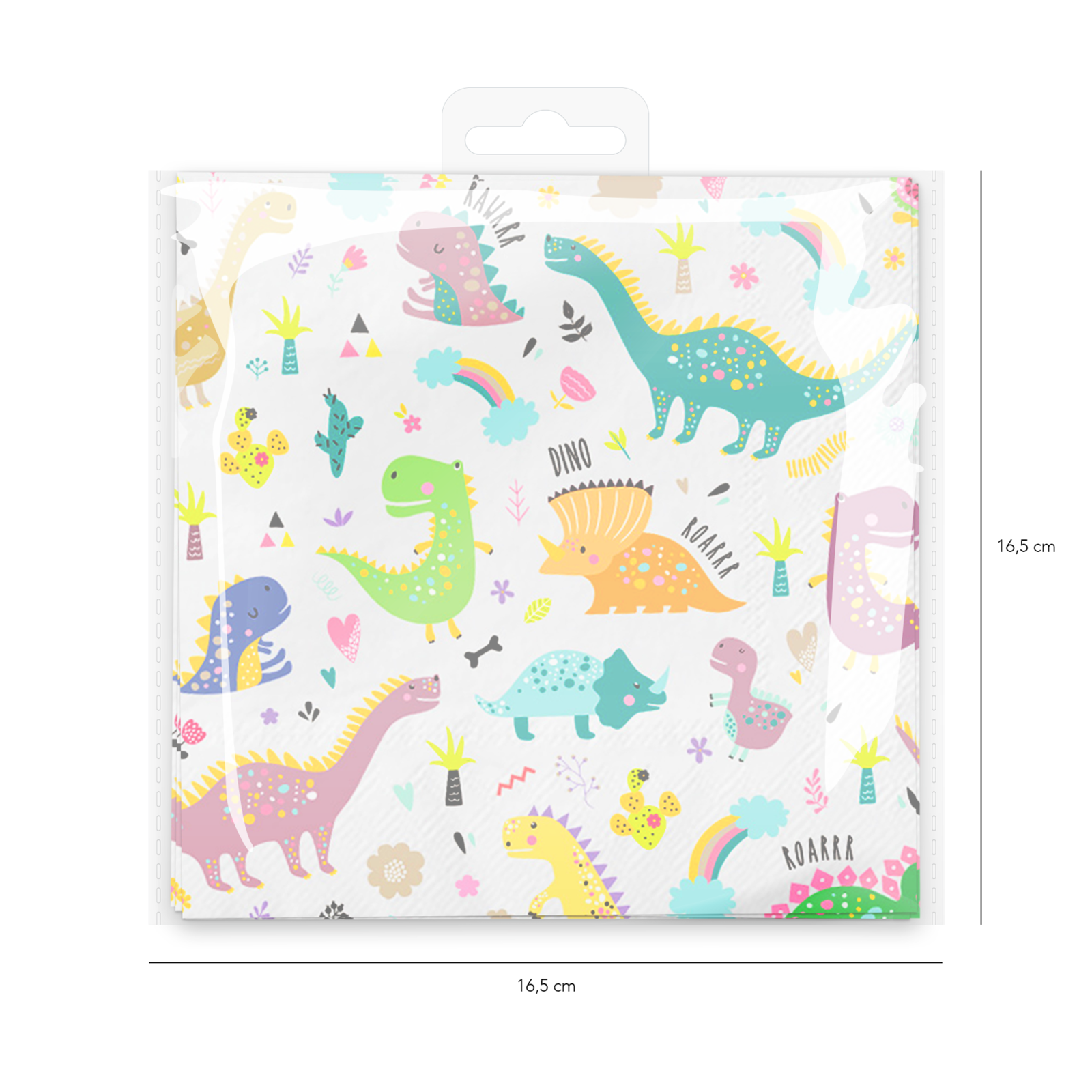 Vesele papirnate salvete s motivom dinosaura, idealne za dječje rođendane i tematske zabave. Dimenzije 33x33 cm, izrađene od kvalitetnog papira. U pakiranju je 20 komada.