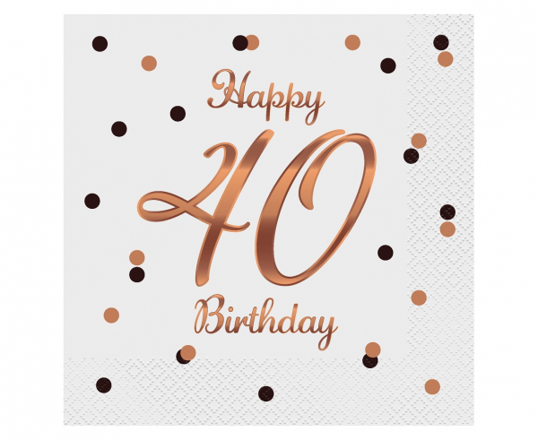 Papirnate salvete dimenzija 33 x 33 cm u bijeloj, zlatnoj i ružičastoj boji s natpisom Happy 40th Birthday. Idealne za elegantne rođendanske stolne dekoracije.