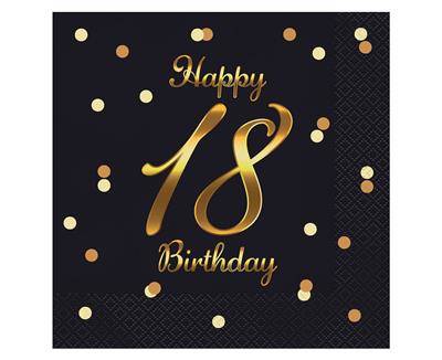 Crne papirnate salvete dimenzija 33x33 cm s otiskom broja 18 i natpisom Happy Birthday savršene su za elegantnu proslavu punoljetnosti i rođendanske stolove.