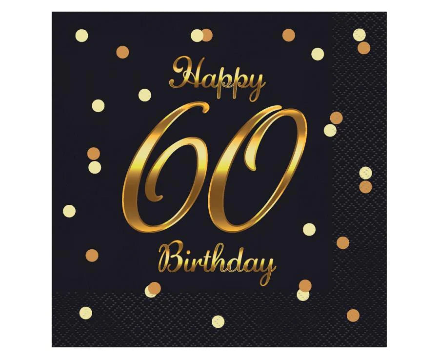 Crno-zlatne salvete s natpisom Happy 60 Birthday daju elegantan i svečan izgled vašoj proslavi. Dimenzije 33×33 cm. U pakiranju se nalazi 20 komada.