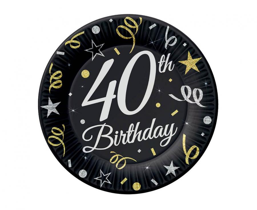 Crni okrugli papirnati tanjuri promjera 18 cm s tiskom 40th Birthday iz kolekcije Beauty&Charm. Pakiranje sadrži 6 komada za rođendanske proslave.