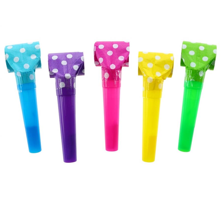 Šarene party trube s bijelim točkicama dolaze u setu od 5 komada. Izrađene od papira i plastike, svaka ima praktičan plastični usnik za sigurnu i zabavnu upotrebu.