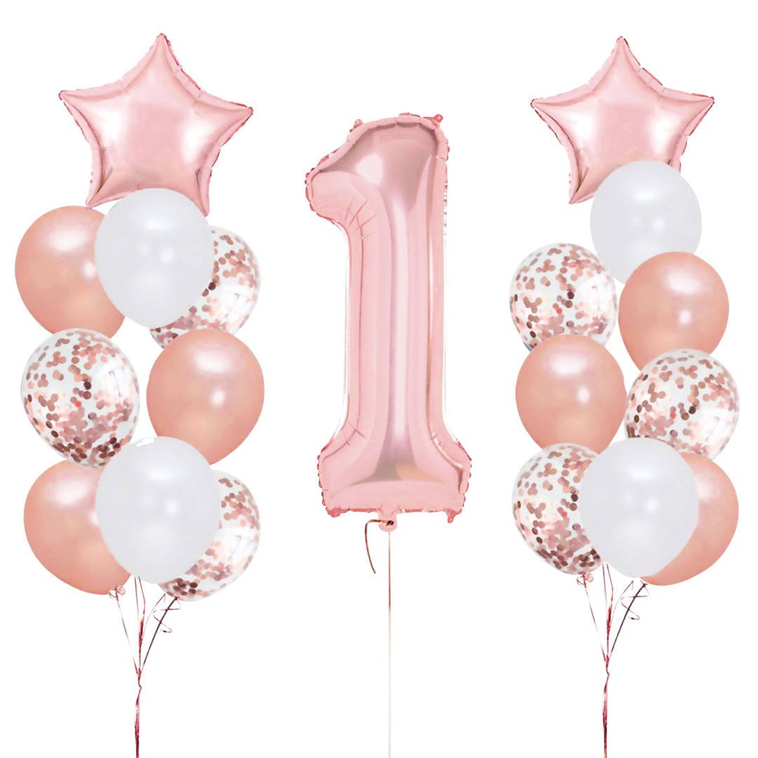 Set od 19 balona za 1. rođendan u Rose Gold boji. Sadrži 16 lateks balona 30 cm, folija broj 1 100 cm i 2 folija zvjezdice 45 cm. Punjenje helijem ili zrakom, CE certifikat.