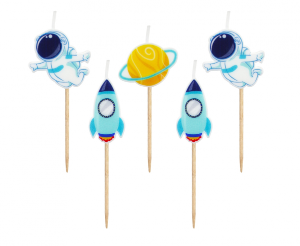 Višebojne svijeće za tortu s motivima rakete, planeta i astronauta visine 4 cm (7,5 cm s držačem) idealne su za dječje rođendane. Pakiranje sadrži 5 komada.